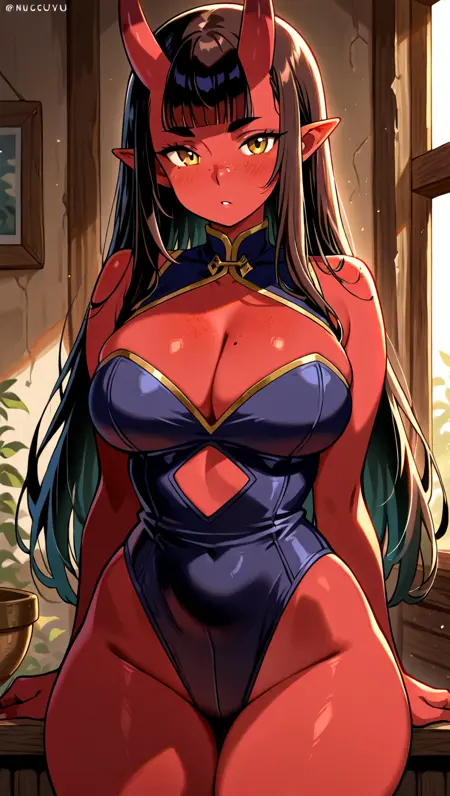 meruccubus, red oni, colored skin, red skin, pointy ears, long hair, mole, oni, blunt bangs, freckles