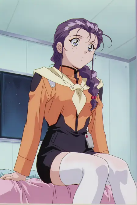 ブリッジ:megu-rei、megu-bridge、1girl、青い目、ほくろ、紫の髪、編み込み、レトロなアートスタイル、長い髪、濃い青と金色の目、大きく表現力豊かな形、強い上まつげライン、オレンジ色のジャケット、黒いショーツ、白いハイソックス、高い襟、ポケット、ベージュのスカーフ、未来志向の服