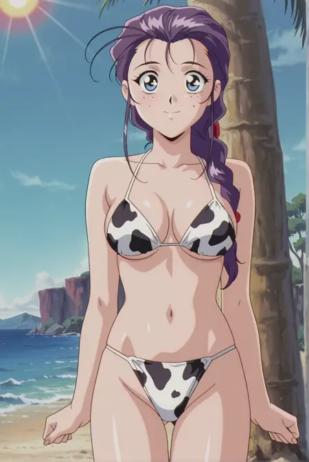 基本:megu-rei、1girl、青い目、ほくろ、紫の髪、編み込み、長い髪、濃い青と金色の目、大きく表現力豊かな形、強い上まつげライン