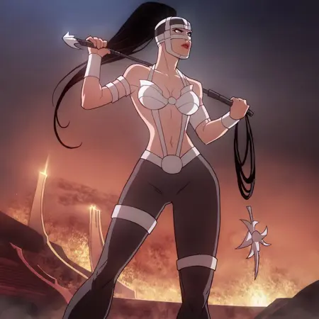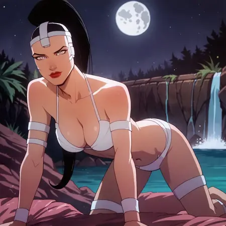 lipstick, black hair, ponytail, long hair, gray eyes, breast, cleavage, mask, armlet, navel, midriff, LashinaSBA