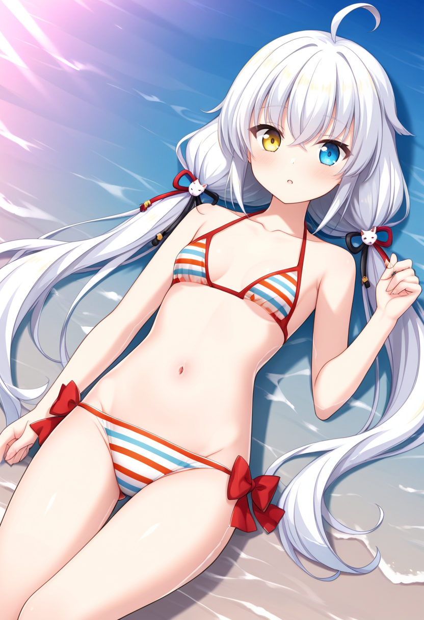 - XIAOFU,1girl,solo,heterochromia,white hair,ahoge,twintails,single braid,cat hair ornament,hair bow,striped bow,hairclip,hair flower,