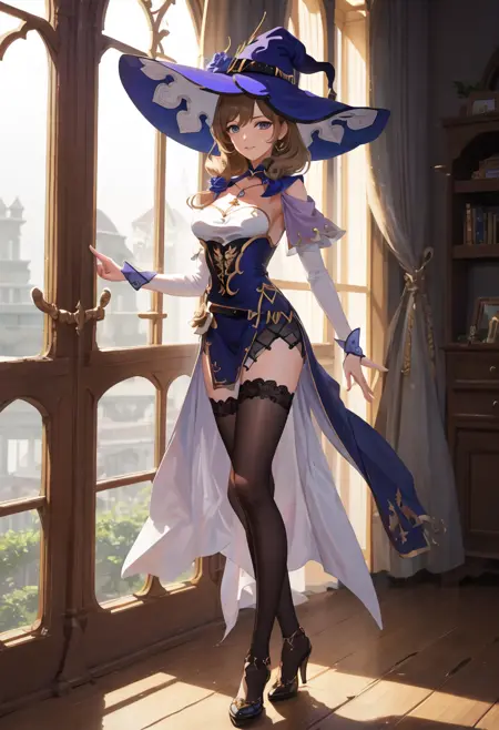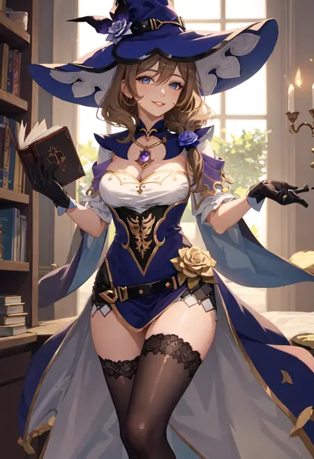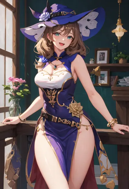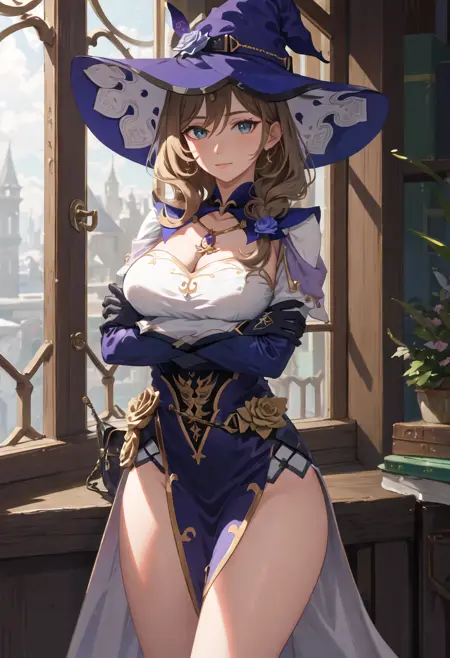 触发词为 lisa_genshin,精简标签为 long_hair, breasts, green_eyes, brown_hair, bangs, large_breasts, hat, witch_hat, purple_headwear, hair_between_eyes, hair_ornament, hair_flower。当某些特征(如发色)有时不够稳定时,您可将这些标签添加到提示词中。