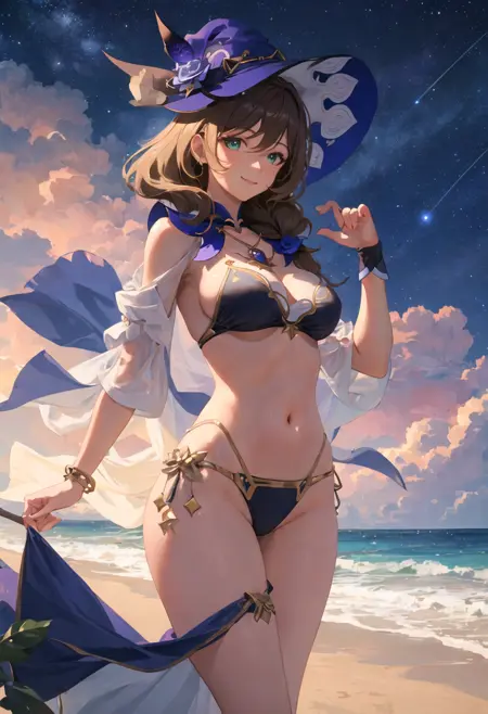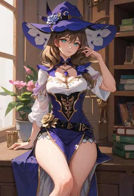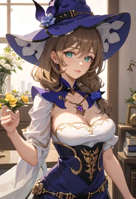 - 精简后的角色标签为:long_hair、breasts、green_eyes、brown_hair、bangs、large_breasts、hat、witch_hat、purple_headwear、hair_between_eyes、hair_ornament、hair_flower。当角色的核心特征(如发色)不够稳定时,您可以在提示词中添加这些标签。