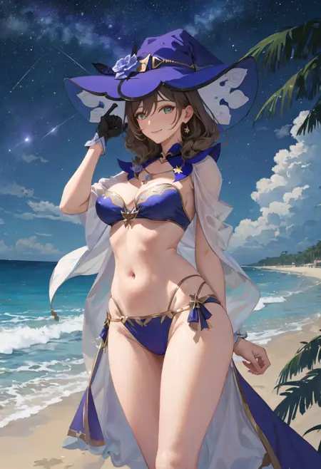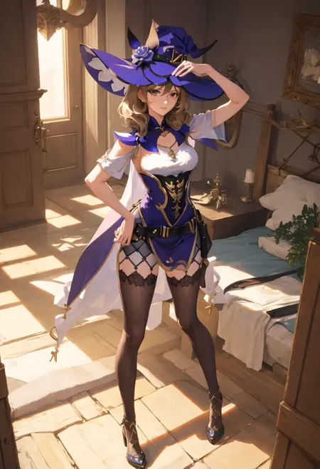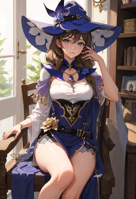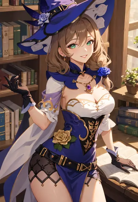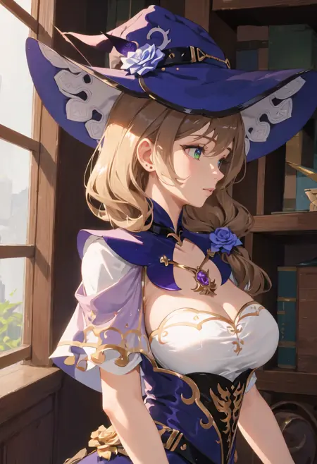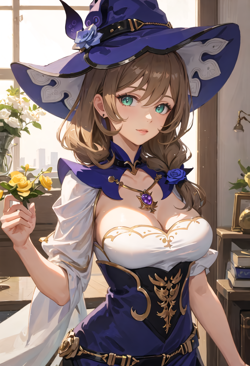 触发词为 lisa_genshin,精简标签为 long_hair, breasts, green_eyes, brown_hair, bangs, large_breasts, hat, witch_hat, purple_headwear, hair_between_eyes, hair_ornament, hair_flower当某些特征(如发色)有时不够稳定时,您可将这些标签添加到提示词中