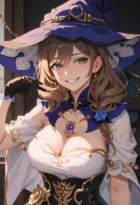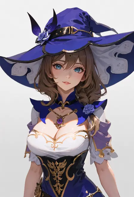 • 精简后的角色标签为:long_hair、breasts、green_eyes、brown_hair、bangs、large_breasts、hat、witch_hat、purple_headwear、hair_between_eyes、hair_ornament、hair_flower。当角色的核心特征(如发色)不够稳定时,您可以在提示词中添加这些标签