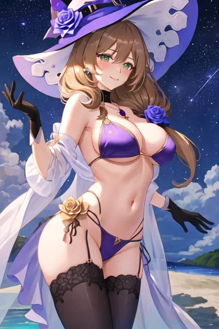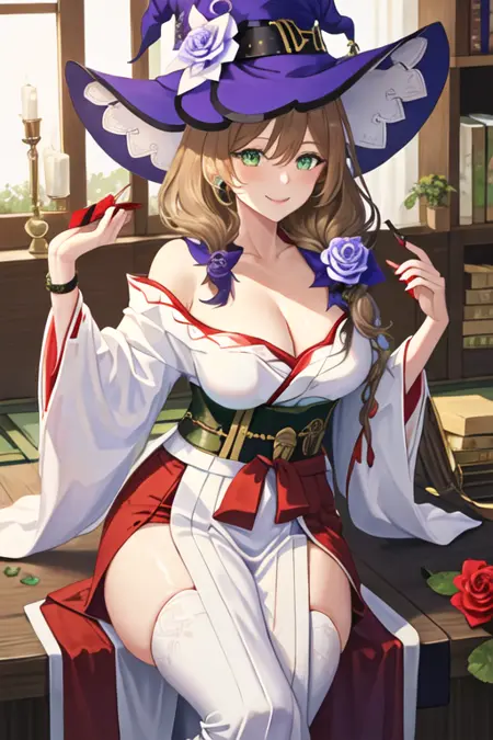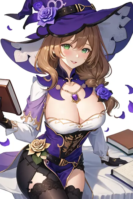 - 精简后的角色标签为:long_hair、breasts、green_eyes、brown_hair、bangs、large_breasts、hat、witch_hat、purple_headwear、hair_between_eyes、hair_ornament、hair_flower。当角色的核心特征(如发色)不够稳定时,您可以在提示词中添加这些标签。
