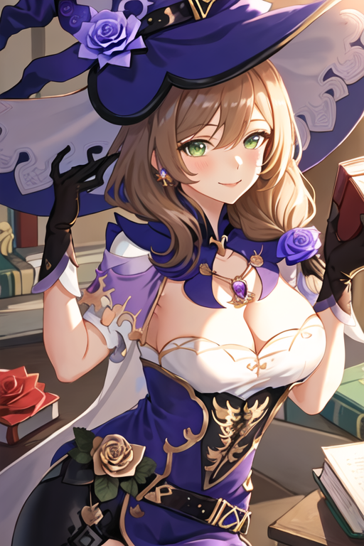 触发词为 lisa_genshin,精简标签为 long_hair, breasts, green_eyes, brown_hair, bangs, large_breasts, hat, witch_hat, purple_headwear, hair_between_eyes, hair_ornament, hair_flower。当某些特征(如发色)有时不够稳定时,您可将这些标签添加到提示词中。
