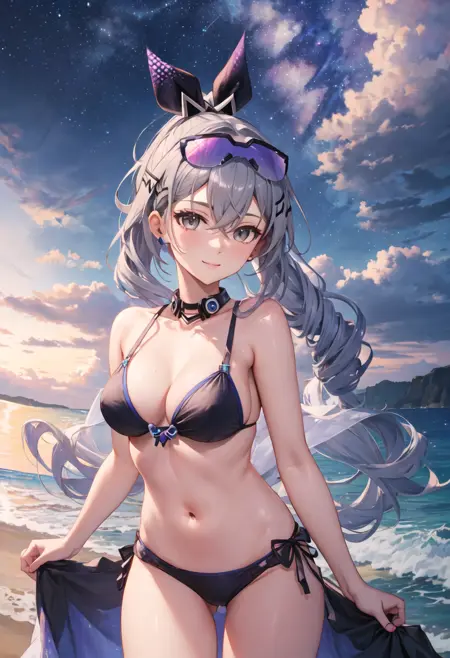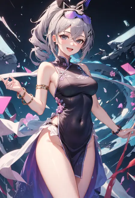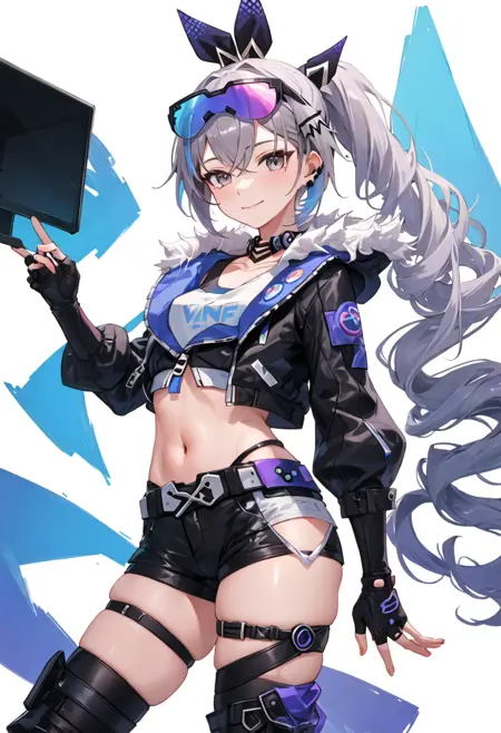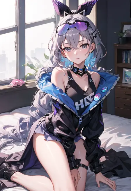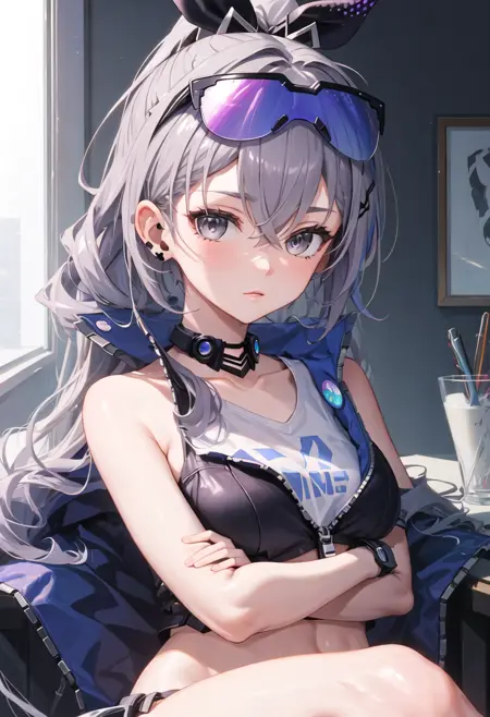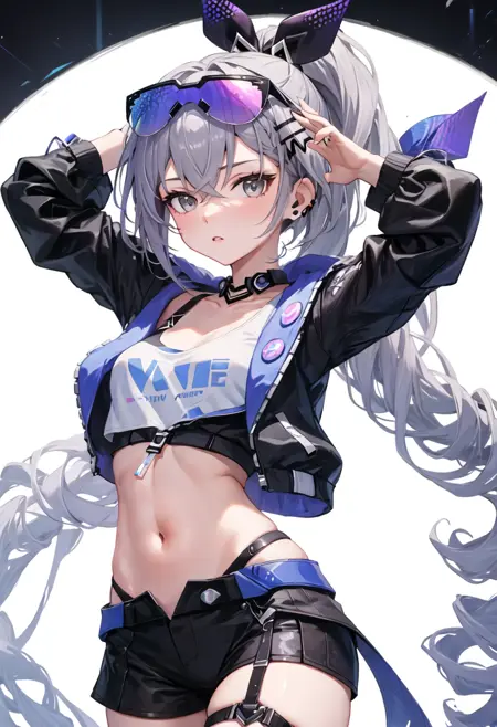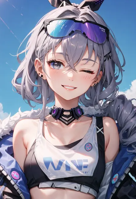 The trigger word is silver_wolf_starrail, and the pruned tags are grey_hair, long_hair, grey_eyes, bangs, eyewear_on_head, ponytail, drill_hair, hair_between_eyes, breasts, sunglasses, hair_ornament. When some features (e.g. hair color) are not so stable at some times, you can add these them into your prompt.