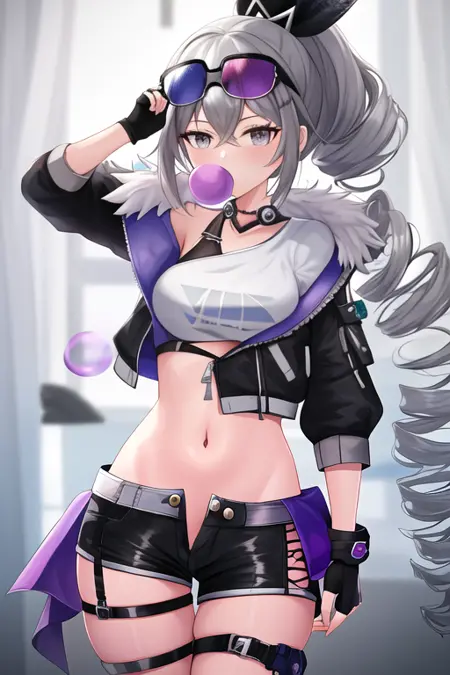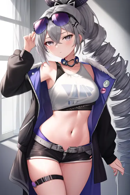 - 已精简的角色标签为:grey_hair、long_hair、grey_eyes、bangs、eyewear_on_head、ponytail、drill_hair、hair_between_eyes、breasts、sunglasses、hair_ornament。当角色的核心特征(如发色)不够稳定时,您可以在提示词中添加这些标签。