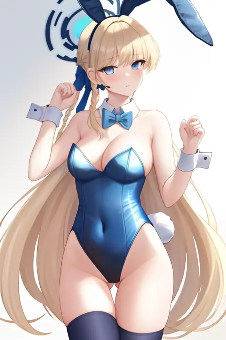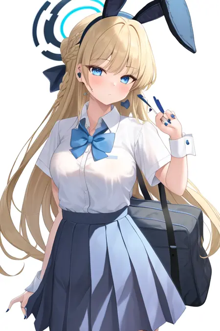 触发词为 toki_bluearchive,精简标签为 blonde_hair, blue_eyes, blue_halo, halo, bow, breasts, blue_bow, braid, long_hair, medium_breasts, animal_ears, fake_animal_ears, rabbit_ears, very_long_hair, hairband, blue_hairband, multicolored_hair。当某些特征(如发色)偶尔不稳定时,您可将这些标签添加至提示词中。