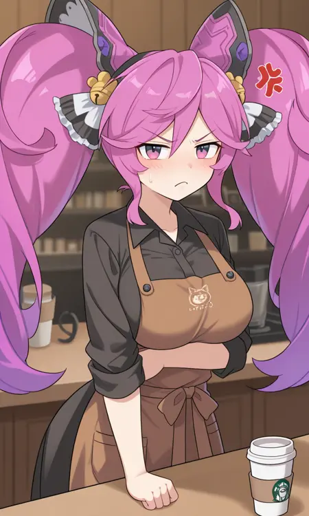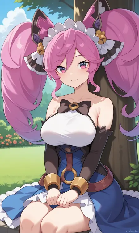 cleo, pink hair, pink eyes, large breasts, twintails, dress