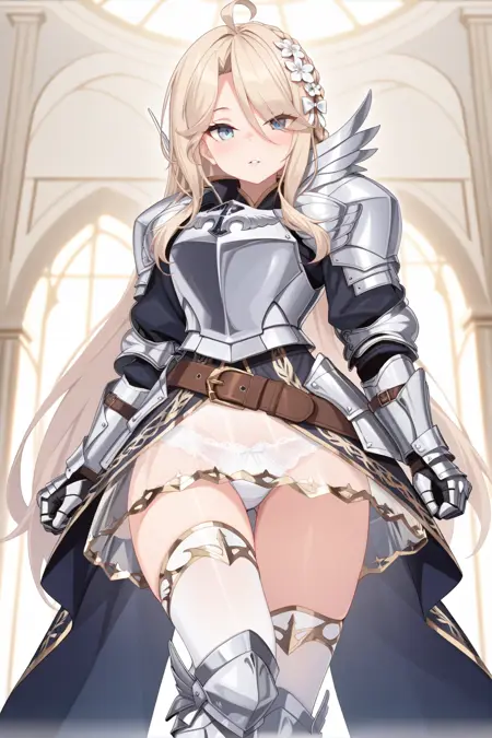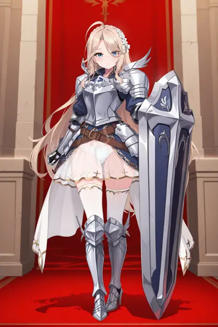 파란 드레스, 갑옷 드레스, 반짝이는 갑옷, 가슴판, 어깨 보호대, 어깨 갑옷, 전완 보호대, 팔꿈치 보호대, 장갑, 갈색 벨트, 벨트 버클, 허벅지 보호대, 무릎 보호대, 종아리 보호대,