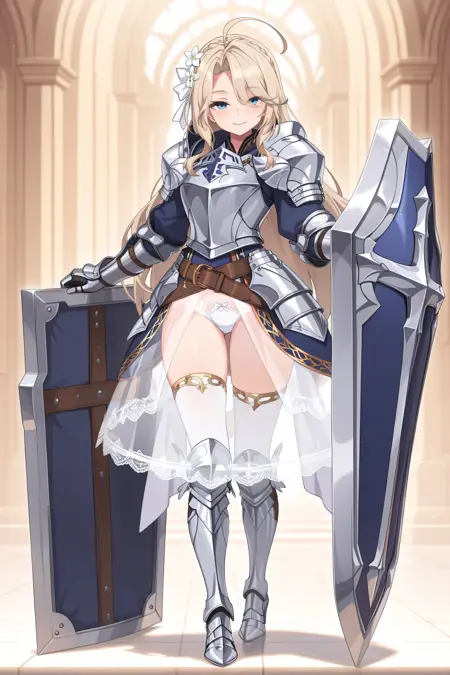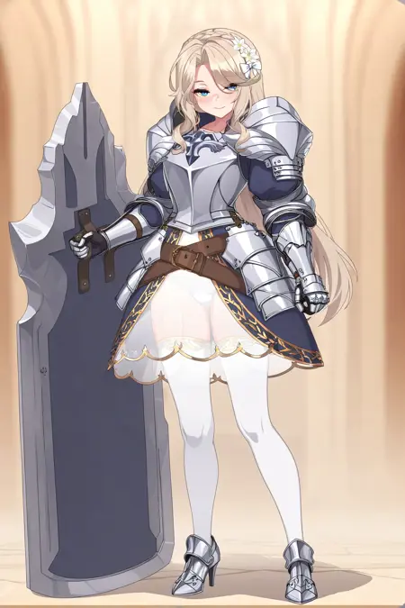 蓝色长裙,盔甲长裙,闪耀盔甲,胸甲,肩甲,护肩,上臂甲,前臂甲,手套,棕色腰带,腰带扣,护腿甲,膝甲,胫甲,