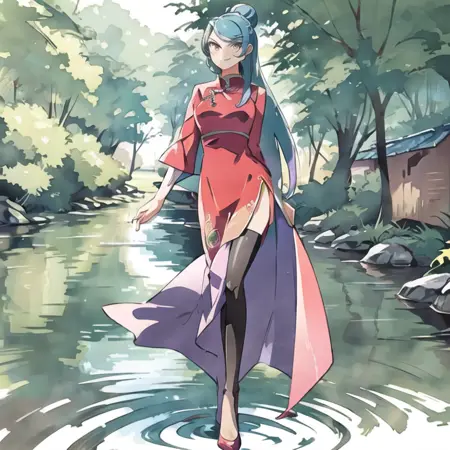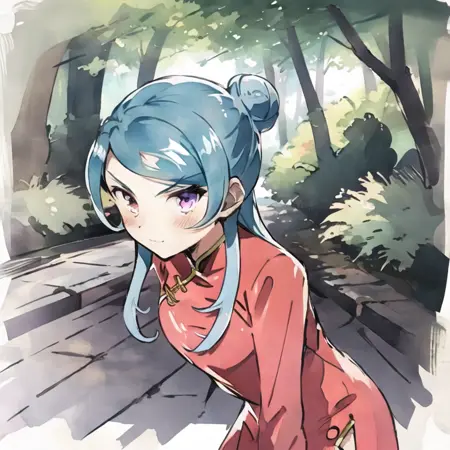 头发/特征:长发,非常长的头发,紫色头发,蓝色头发,紫色眼睛,V形眉毛,侧拂刘海