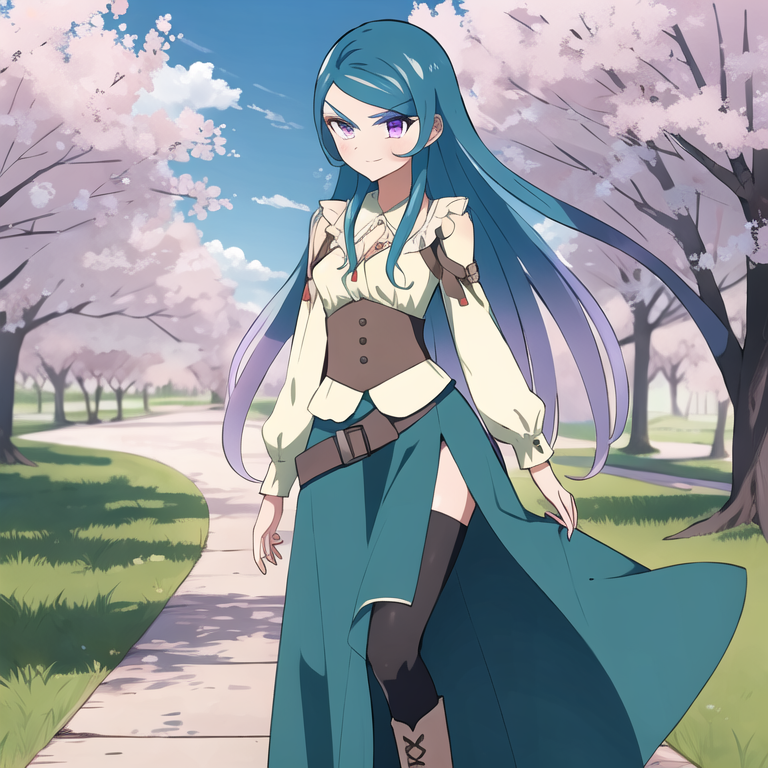 服装:过膝袜,靴子,腰带,长裙,荷叶边衬衫,长袖,蓝色裙子,束胸衣,项链,珠宝