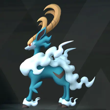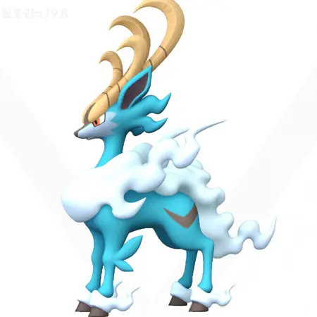 has a cloud-like mane and branched golden horns, a horned f3ngl0pe creature with blue fur, the horned f3ngl0pe creature has black hooves