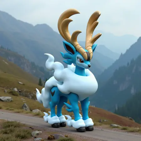 has a cloud-like mane and branched golden horns, a horned f3ngl0pe creature with blue fur, the horned f3ngl0pe creature has black hooves