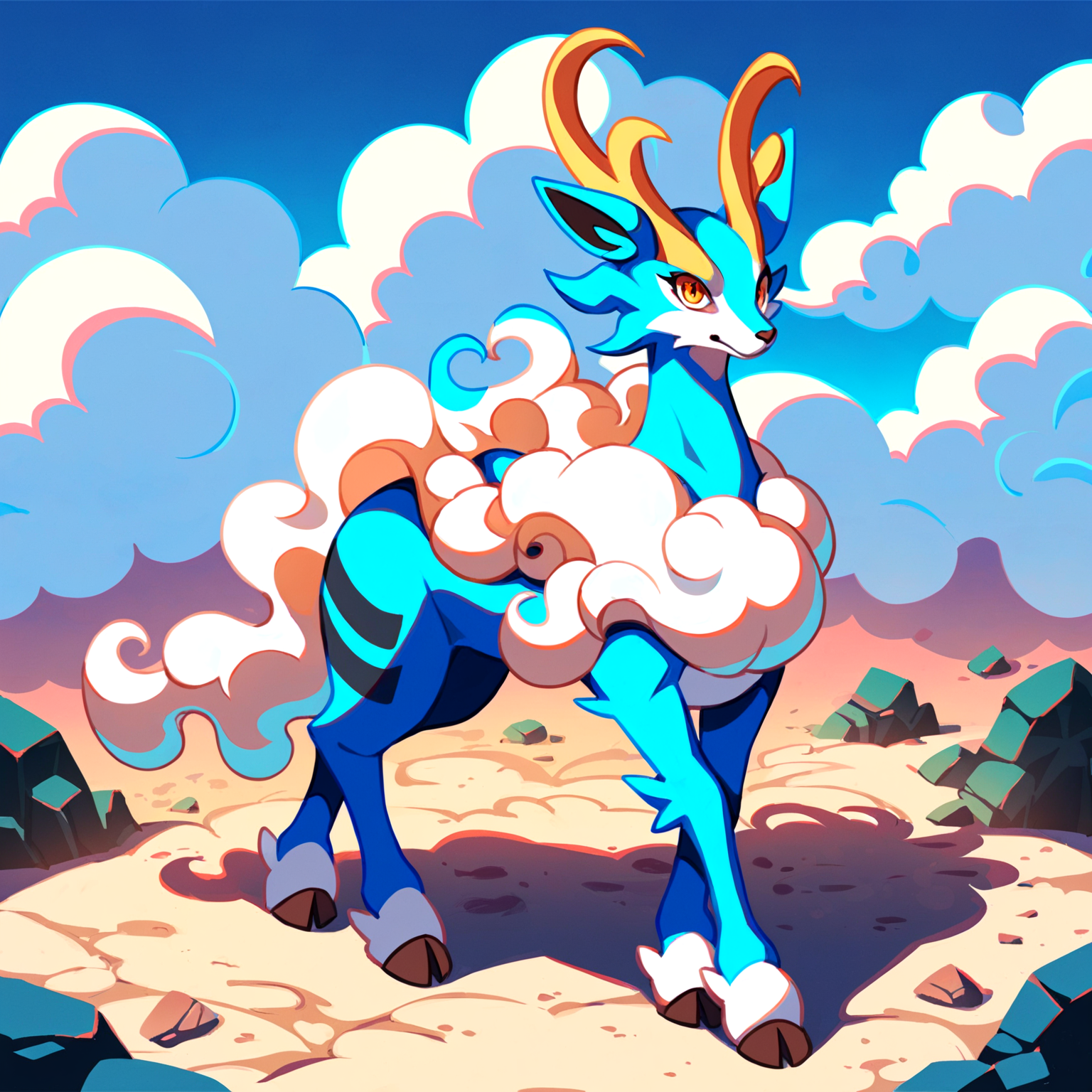 has a cloud-like mane and branched golden horns, a horned f3ngl0pe creature with blue fur, the horned f3ngl0pe creature has black hooves