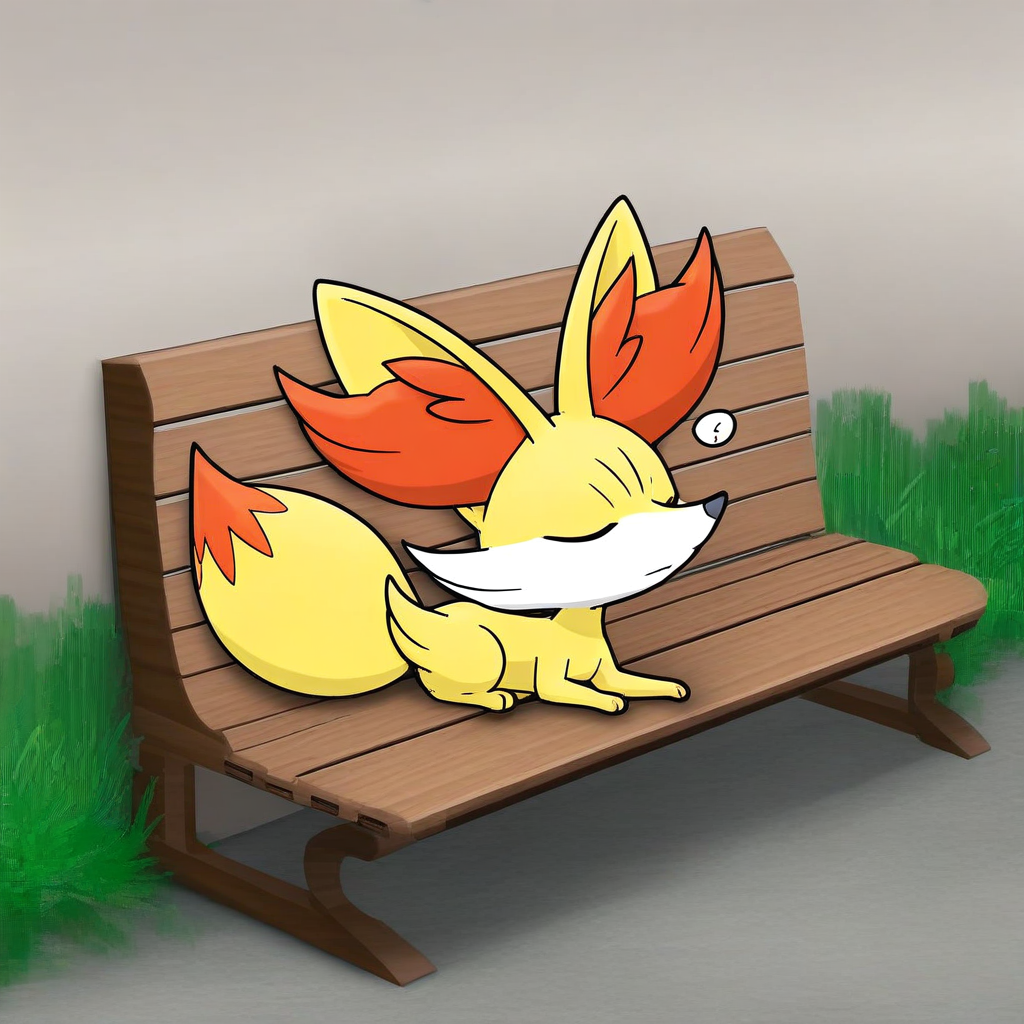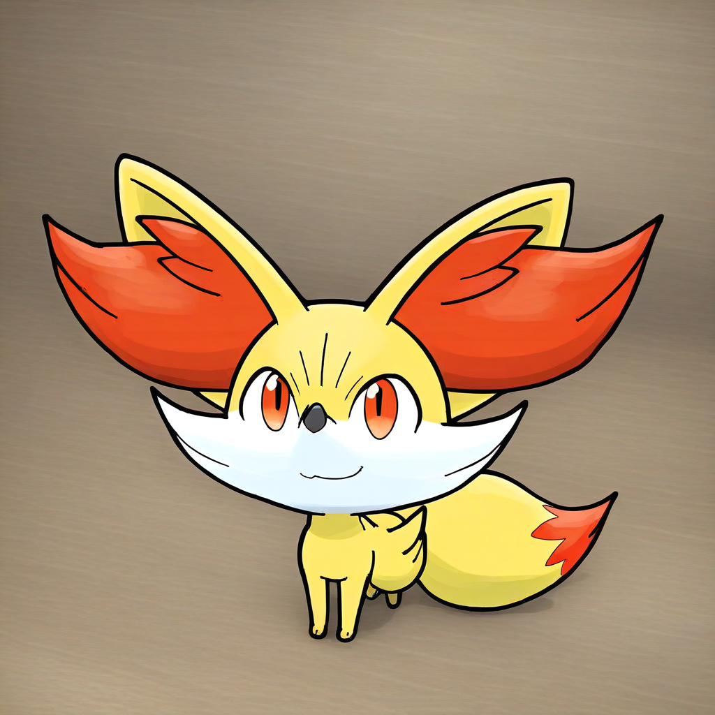 Fennekin, quadrupedal, fox, small, yellow fur, big ears, red ear tufts, orange eyes, black nose, bushy foxtail,