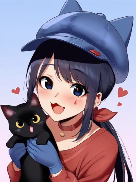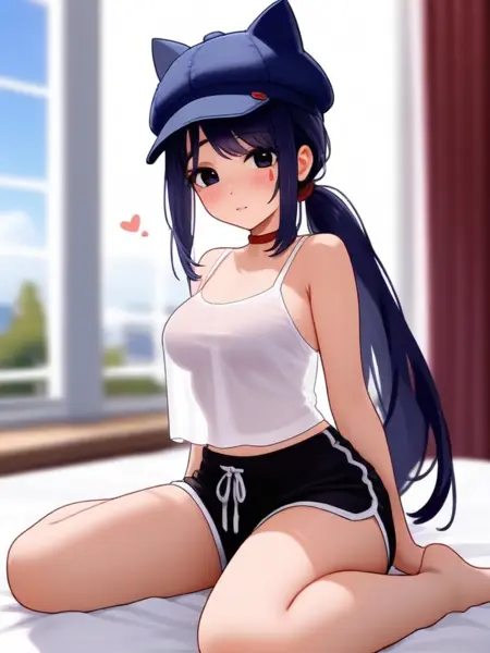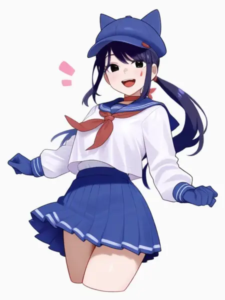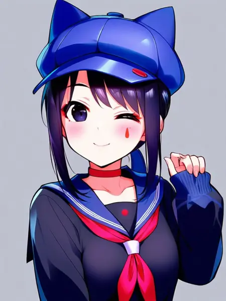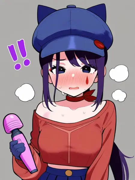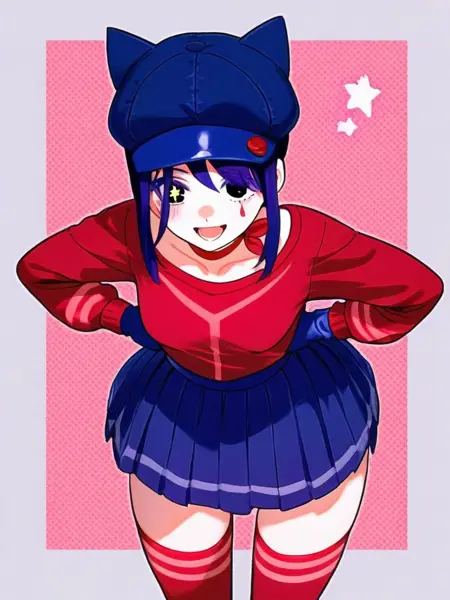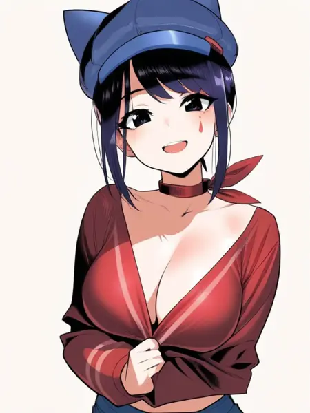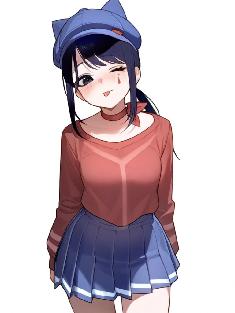hatmita,solo,1girl,solo,medium breasts,pleated skirt,long sleeves,red shirt,crop top,miniskirt,blue hat,teardrop_facial_mark,