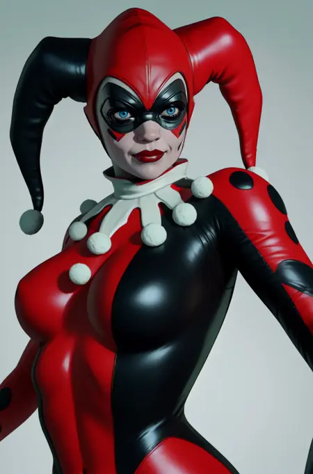 红黑紧身衣,多米诺面具,小丑帽,蕾丝领,白色手套,——紧身贴体,