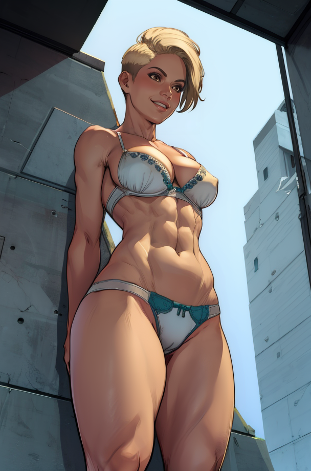 Cora, brown eyes, blonde hair, short hair,