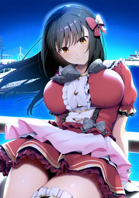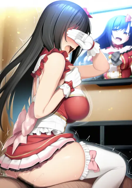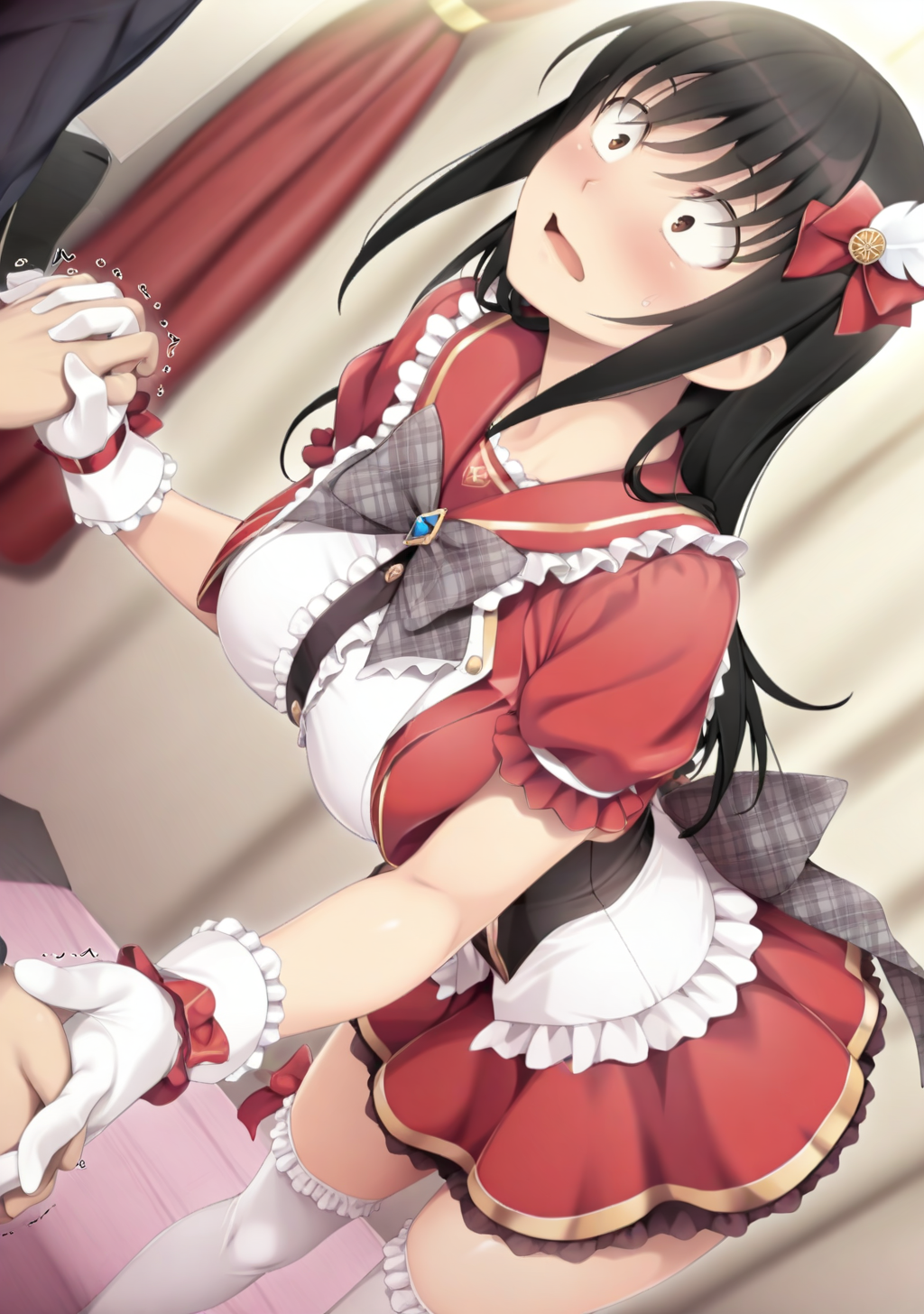 "idol 복장, 머리 장식, 빨간 드레스, 프릴, 치마, 리본, 흰색 허벅지 양말, 흰장갑"
