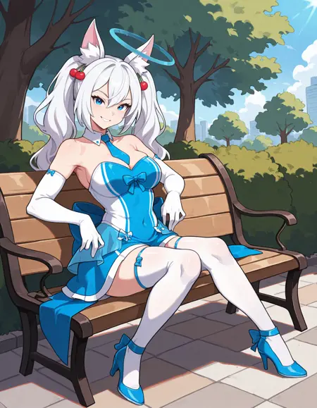 原始服装: k1r0ri,长银发,大乳房,光环,双马尾,蓬松尾巴,樱桃发饰,蓝色连衣裙,无肩带连衣裙,可拆卸领子,蓝色领带,白色肘套,白色过膝袜,蓝色高跟鞋,樱桃尾饰