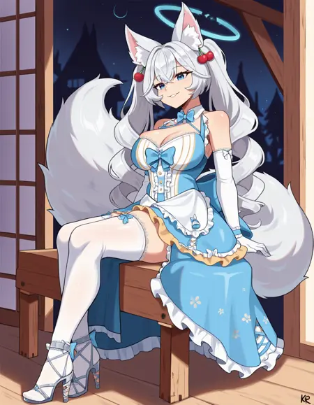 外观: k1r,长银发,双马尾,樱桃发饰,光环,蓝眼睛,蓬松尾巴,大乳房,粗大腿