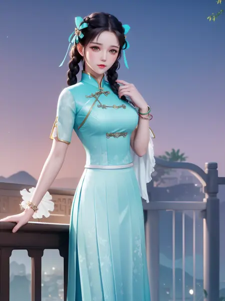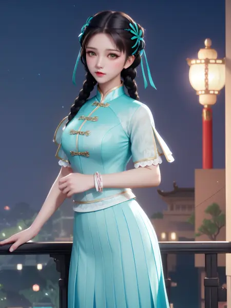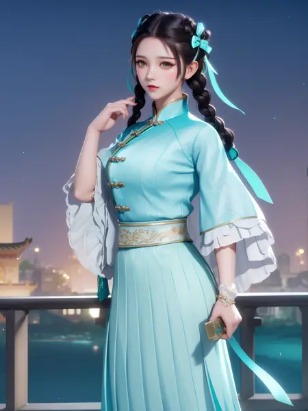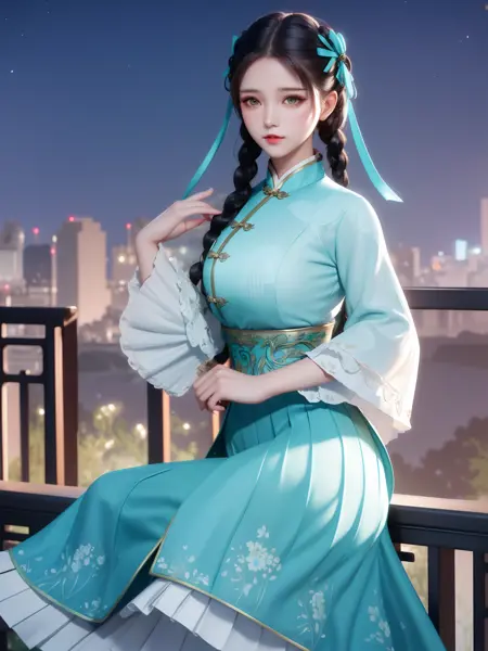 - WZRYxishiSYJN, 1girl, solo, jewelry, bracelet, dress, black hair, twin braids, looking at viewer, chinese clothes, long hair,brown eyes, wide sleeves, blue ribbon,lora:WZRYxishiSYJN:0.75,cityscape, night, hand on hip, white pantyhose,