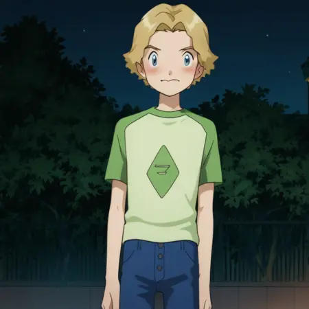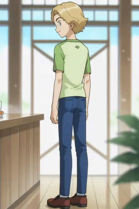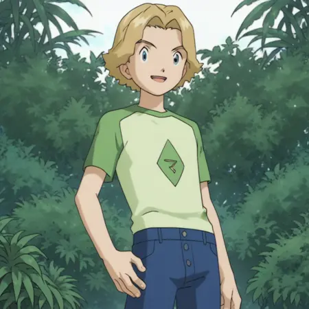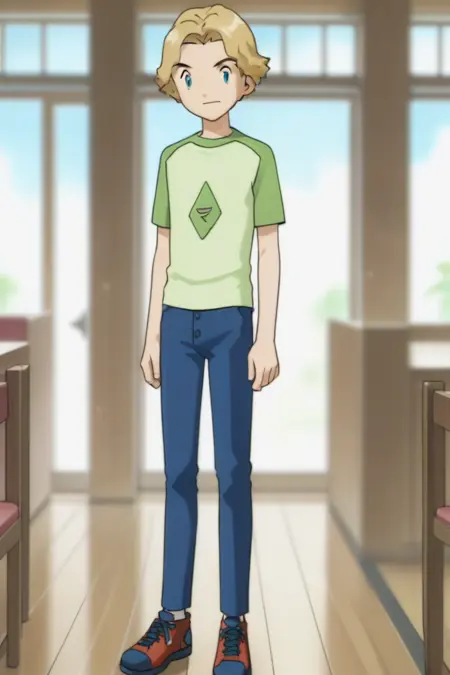 Prompts: male, blonde hair, blue eyes, green t-shirt, green print shirt, blue pants, shoes, indoors (restaurant), outdoors (jungle/sky/plant/bush), outdoors (central park)