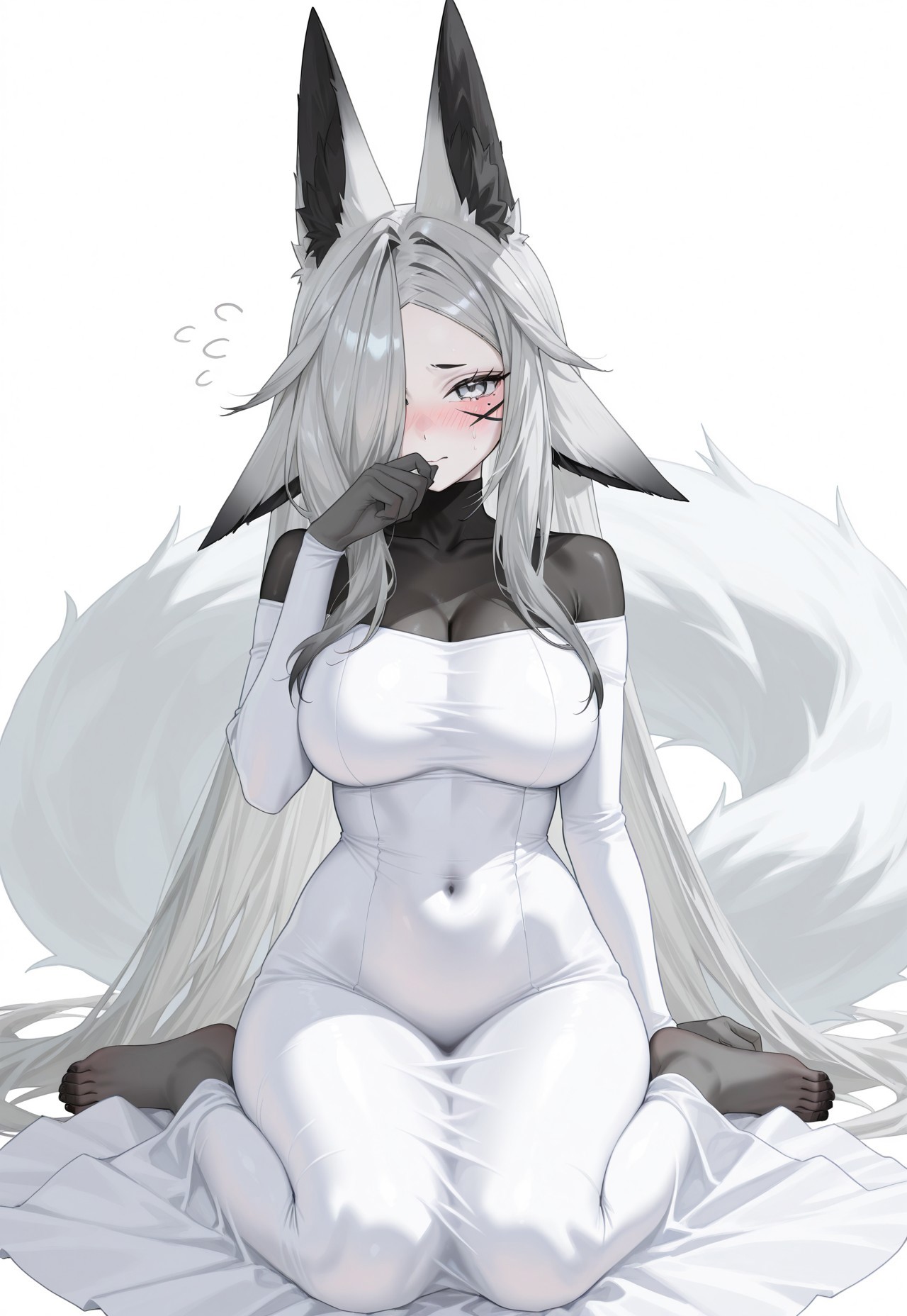 dyarikkuSecond, 1girl, tail, animal ears, red eyes, boots, solo, sleeves past wrists, fox ears, hood, fox tail, covered navel, black footwear, shorts, sleeves past fingers, fox girl, grey hair, open mouth, sitting, white background, colored tongue, knee boots, black shorts, smile, short shorts, hoodie, long sleeves, bodystocking, pantyhose, full body, looking at viewer, simple background, o-ring, long hair, :d, platform footwear, cropped hoodie, hood down, blue tongue, purple tongue, red hoodie, bodysuit, fang, hair over one eye, hand up, white skin, grey skin, two-tone skin