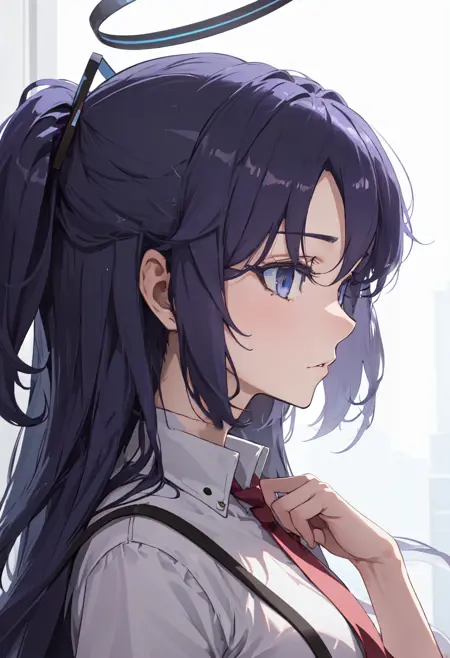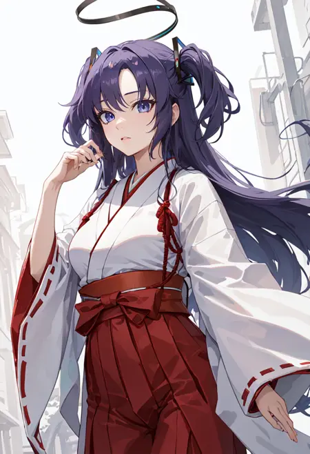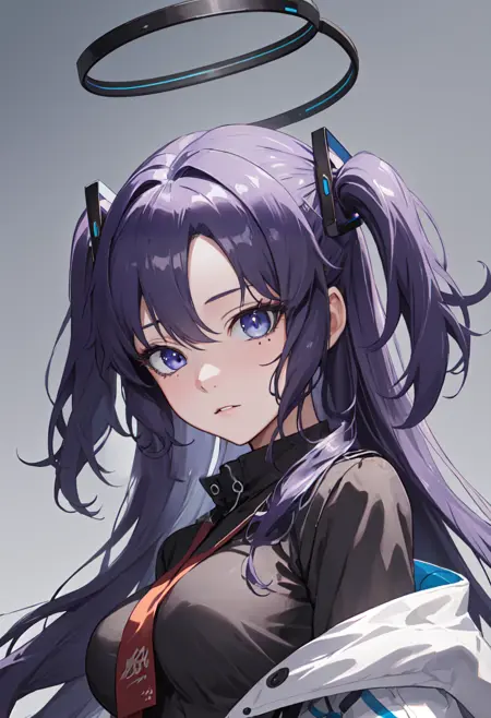 - 축소된 캐릭터 태그는 halo, purple hair, long hair, mechanical halo, purple eyes, breasts, two side up, blue eyes, parted bangs, ponytail, medium breasts입니다. 캐릭터의 핵심 특징(예: 머리색)이 안정적이지 않을 때 이 태그들을 프롬프트에 추가할 수 있습니다.