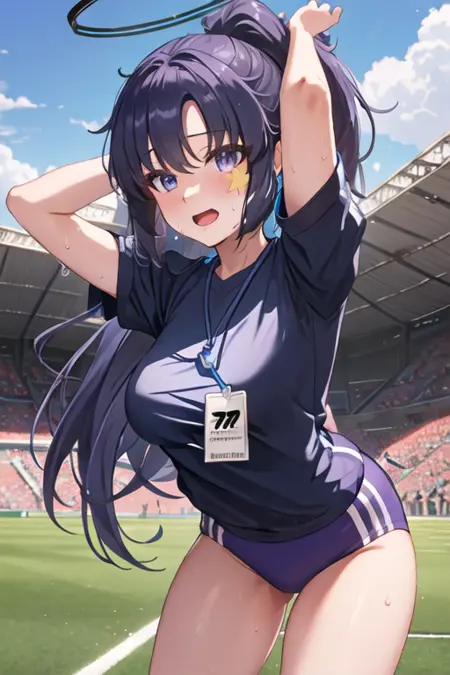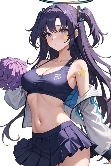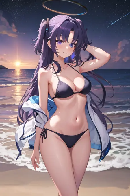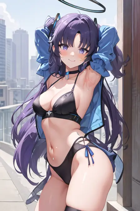The trigger word is yuuka_bluearchive, and the pruned tags are halo, purple_hair, long_hair, mechanical_halo, purple_eyes, breasts, two_side_up, blue_eyes, parted_bangs, ponytail, medium_breasts. When some features (e.g. hair color) are not so stable at some times, you can add these them into your prompt.