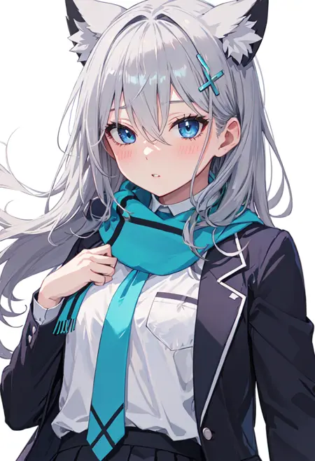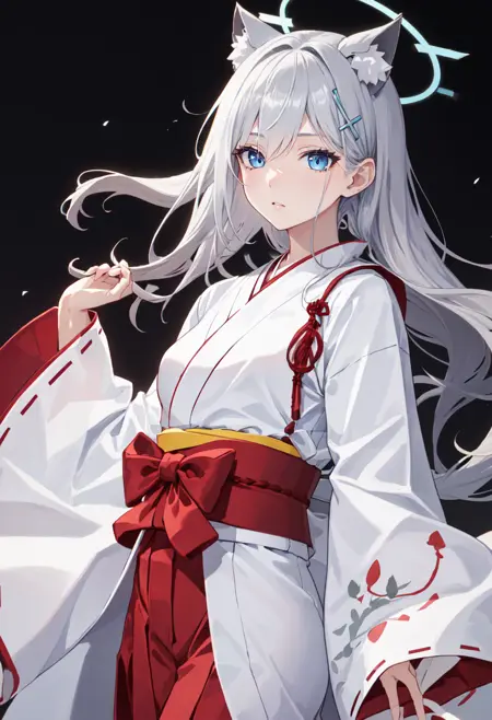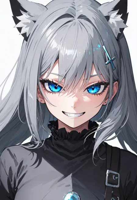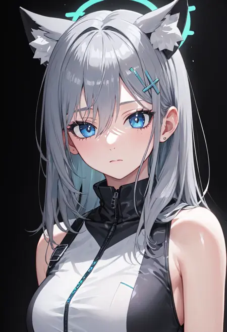 - 축소된 캐릭터 태그는 동물 귀, 회색 머리카락, 늑대 귀, 동물 귀 털, 파란 눈, 홀로, 머리 장식, 십자형 머리 장식, 불일치하는 동공, 추가 귀, 중간 길이 머리, 가슴, 중간 크기 가슴입니다. 캐릭터의 핵심 특징(예: 머리카락 색상)이 안정적이지 않을 때 이 태그를 프롬프트에 추가할 수 있습니다.