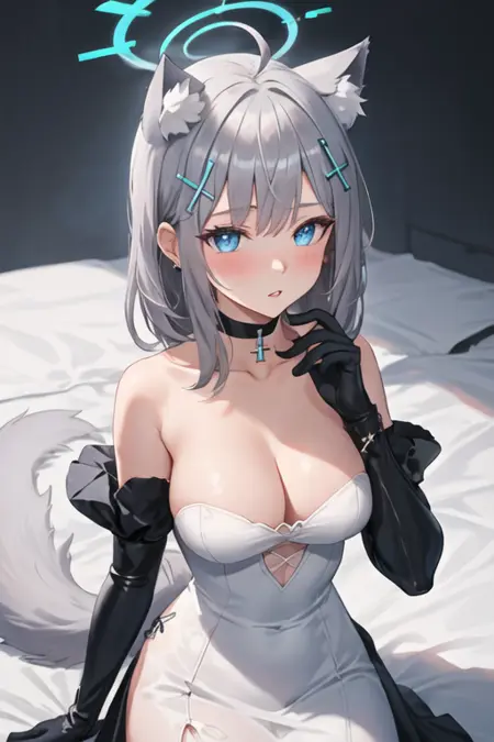 - The pruned character tags are animal ears, grey hair, wolf ears, animal ear fluff, blue eyes, halo, hair ornament, cross hair ornament, mismatched pupils, extra ears, medium hair, breasts, medium breasts. You can add them into prompts when core features (e.g. hair color) of character is not so stable.