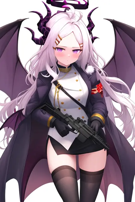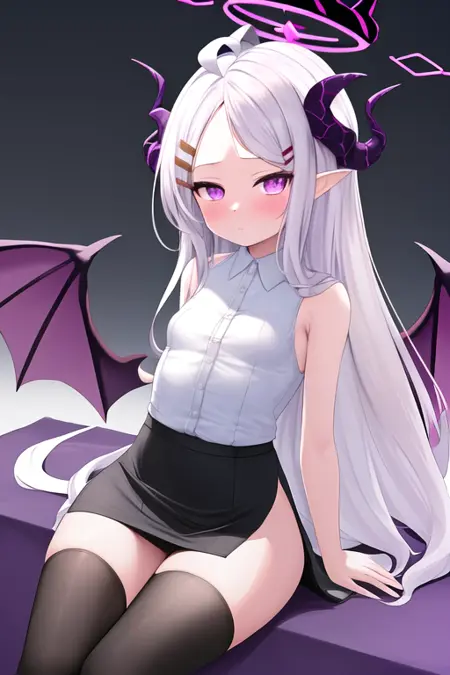 - The pruned character tags are long hair, horns, white hair, purple eyes, demon horns, halo, parted bangs, ahoge, wings, hair ornament, demon wings, hairclip, multiple horns, demon girl, very long hair, sidelocks. You can add them into prompts when core features (e.g. hair color) of character is not so stable.