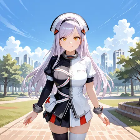 black_lilith, 1girl, solo, thighhighs, long right sleeve short left sleeve, hair ornament, asymmetrical clothes, asymmetrical legwear, dress, nurse cap, collar, wrist_cuffs, waist bag,