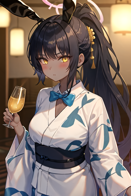 - The pruned character tags are black hair, dark-skinned female, dark skin, long hair, yellow eyes, breasts, large breasts, halo, very long hair, bow, ponytail, blue bow, animal ears, rabbit ears, fake animal ears. You can add them into prompts when core features (e.g. hair color) of character is not so stable.