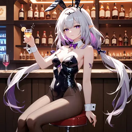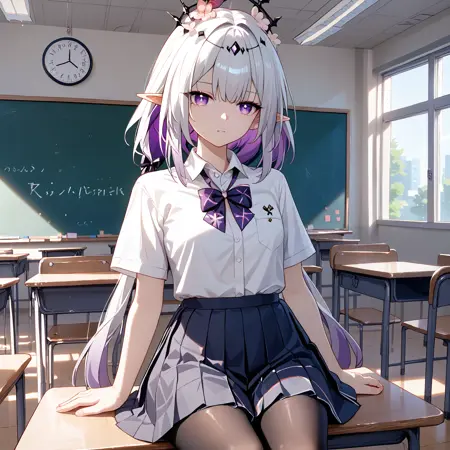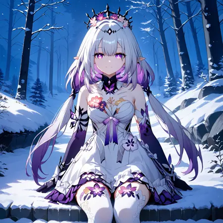 Default : castorice_(honkai:_star_rail), purple eyes, white hair, multicolored hair, colored inner hair, low twintails, pointy ears, crown, two-tone dress, layered dress, elbow gloves, white thighhighs,