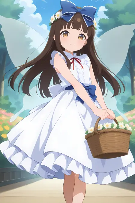 star sapphire, 1girl, solo, brown eyes, brown hair, long hair, fairy, fairy wings,, star sapphire \(white star fairy\), alternate costume, hair bow, blue bow, hair flower, wreath, star hair ornament, black neck ribbon, wedding dress, white dress, sleeveless dress, arm ribbon, back bow, white bow, sandals, footwear flower, holding basket,