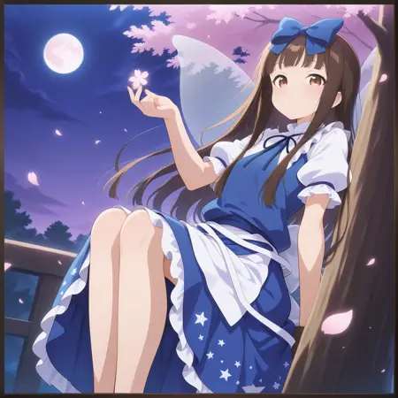 hair bow, blue dress, juliet sleeves, ribbon, star-printed skirt,