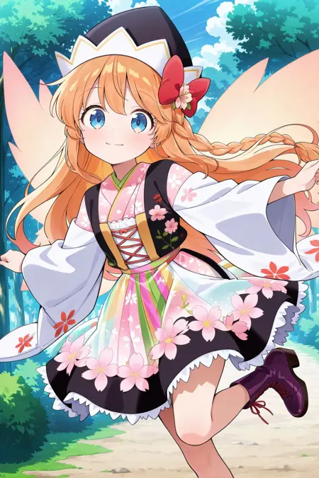 lily white, 1girl, solo, blue eyes, orange hair, long hair, braid, fairy wings, orange wings,, lily white \(spring is the season of growth\), alternate costume, black hat, hat flower, hat bow, red bow, multicolored kimono, black kimono, pink kimono, print kimono, floral print, long sleeves, wide sleeves, white sleeves, cross-laced kimono, multicolored skirt, black skirt, frilled skirt, flower-trimmed skirt, pink flower, purple boots, lace-up boots, high heels, holding megaphone,
