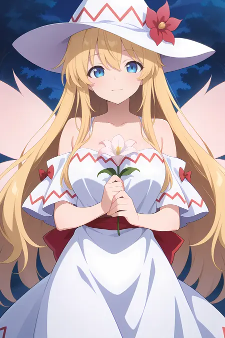 lily white, 1girl, solo, blue eyes, blonde hair, long hair, fairy wings, aged up, alternate hair length, alternate hairstyle, bare shoulders, breasts, dress, hair flower, hair ornament, white hat, hat flower, witch hat, holding flower, very long hair, white dress, wings, collarbone, bare shoulders, witch dress,