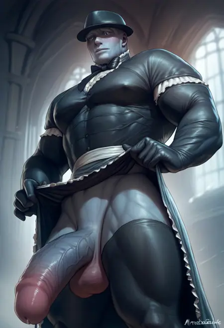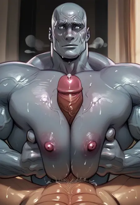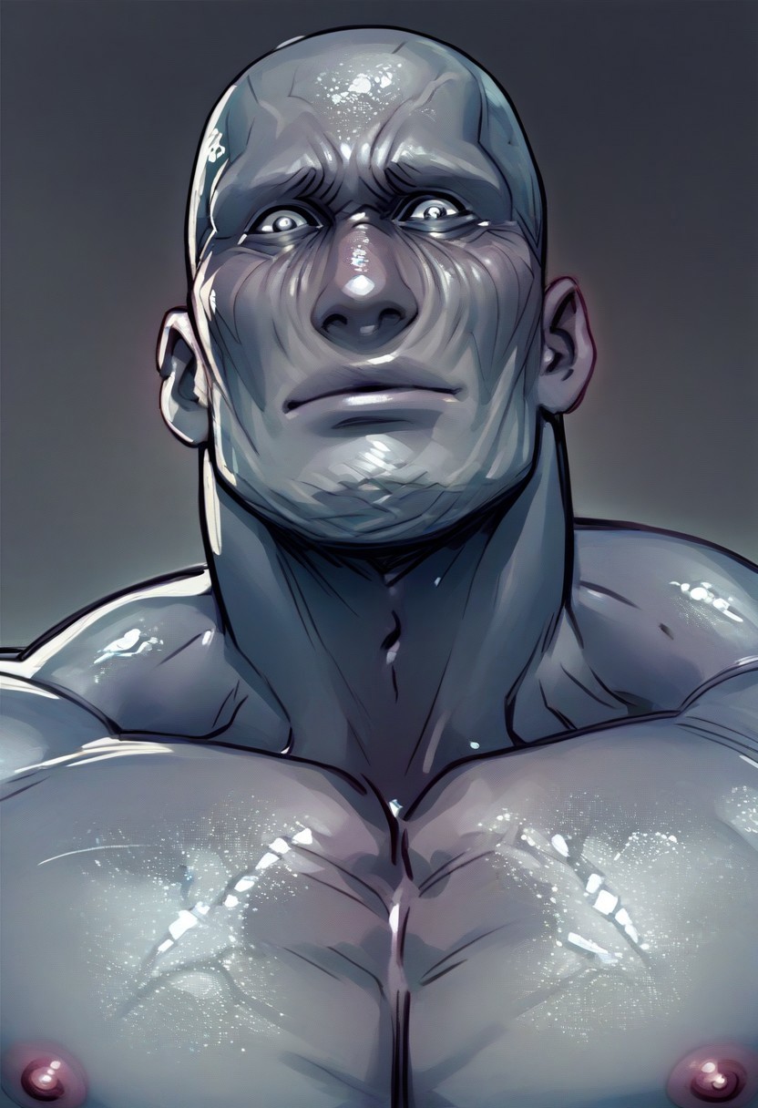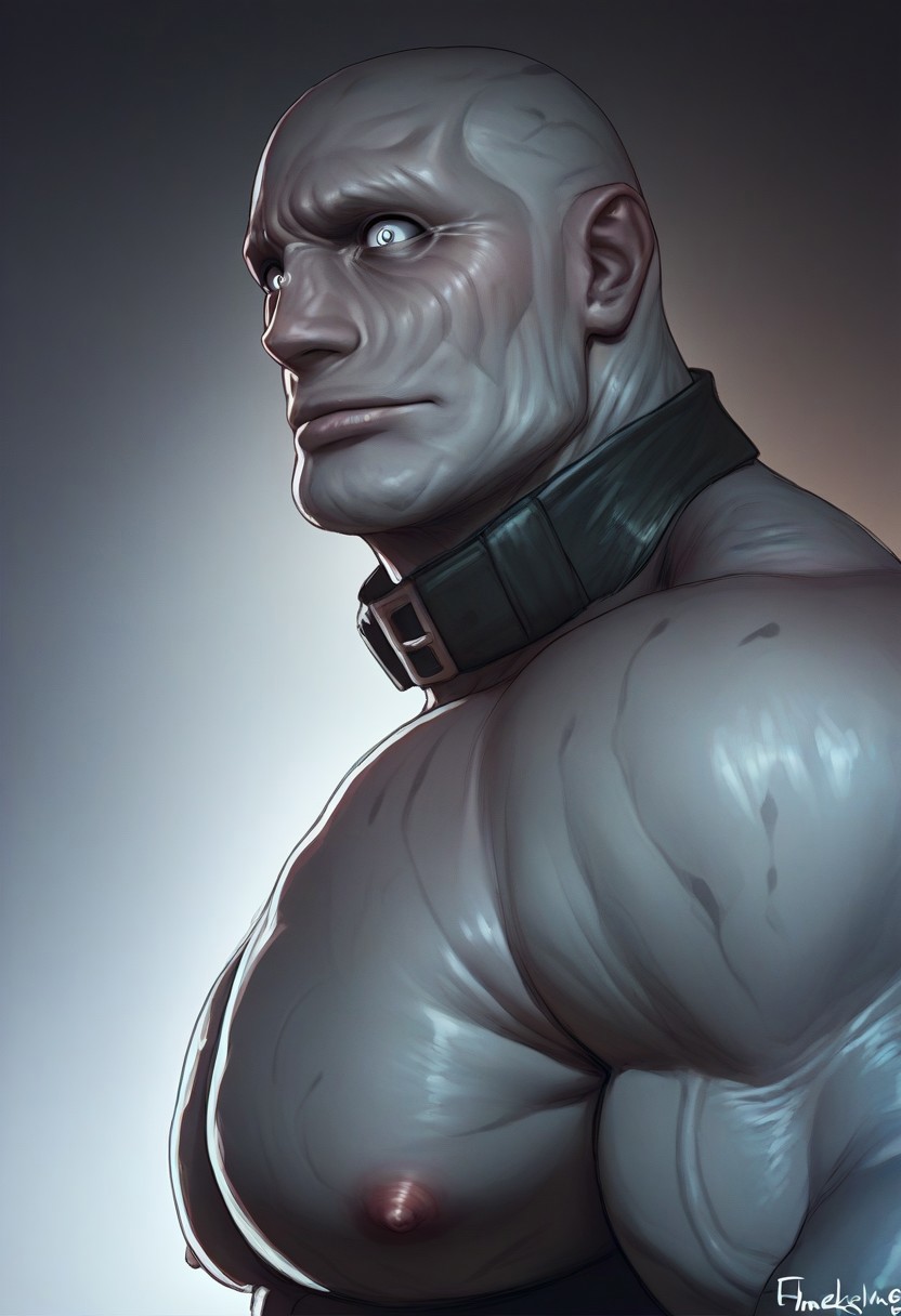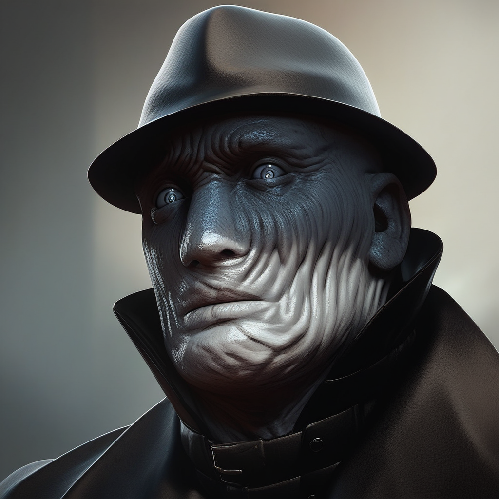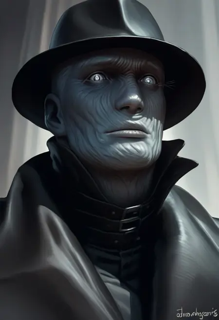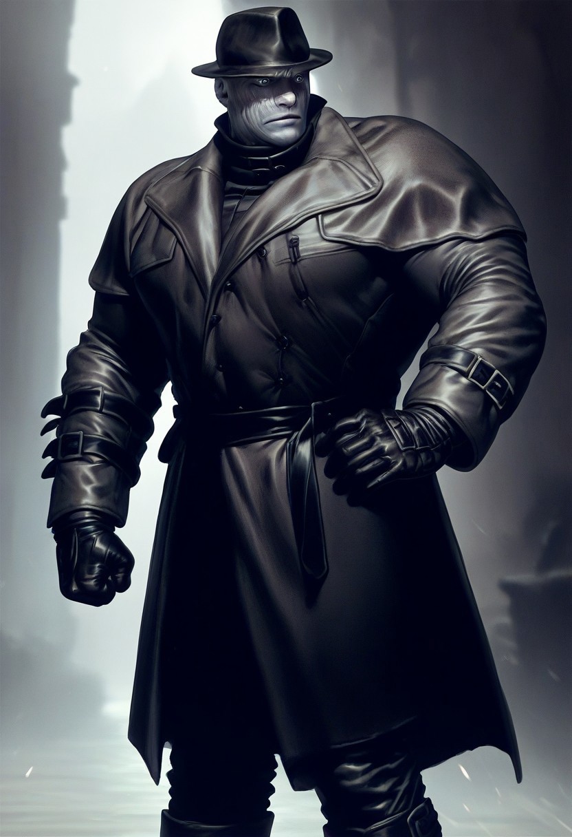 1boy, re_mrx, grey skin, black hat, bald, black coat, grey eyes, black pants, black boots, black gloves, muscular,