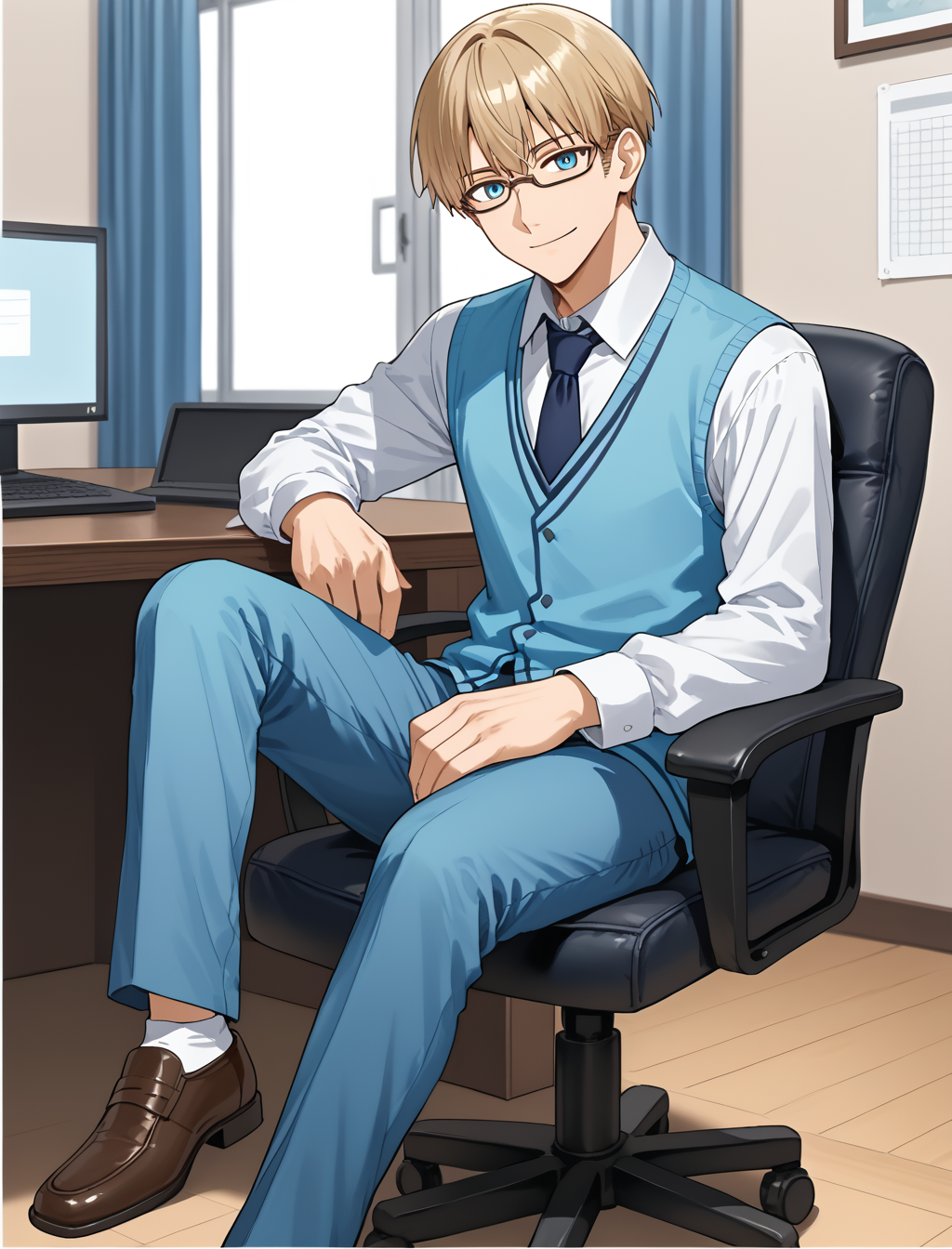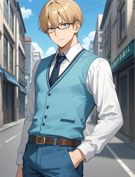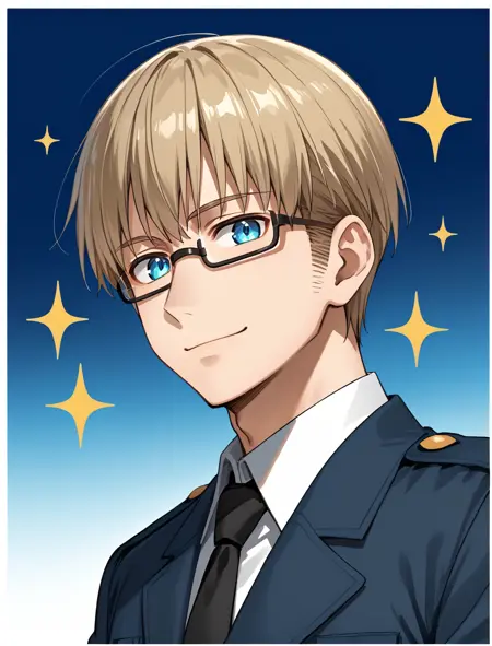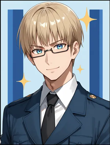 military uniform, blue jacket, necktie, white shirt, belt, blue pants