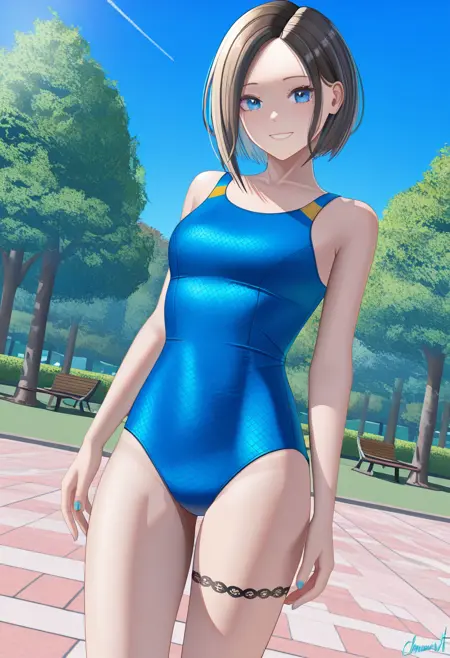 의상 - UniClo, 흰 셔츠, 줄무늬 넥타이, 파란 넥타이, 파란 치마, 체크무늬 치마, 검은 허벅지 긴 양말