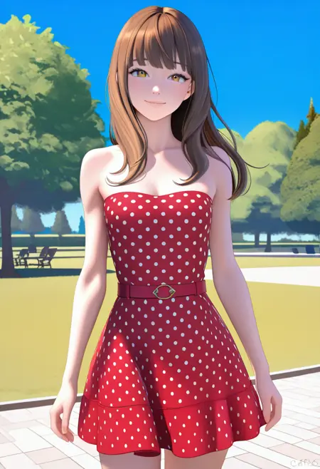 의상 - CafUni, 갈색 머리, 긴 머리, 빨간 드레스, 점무늬 드레스, 어깨없는 드레스