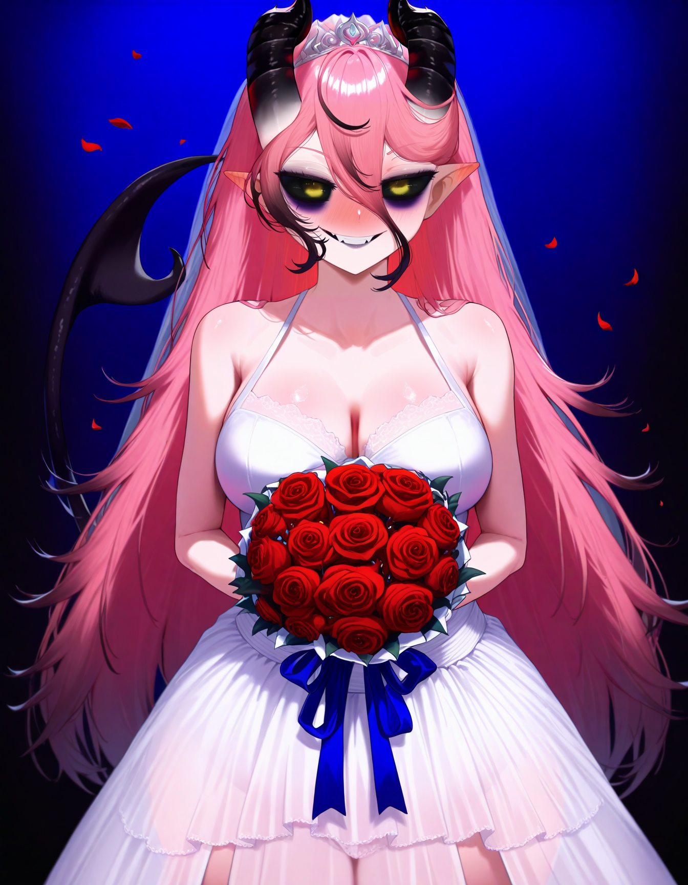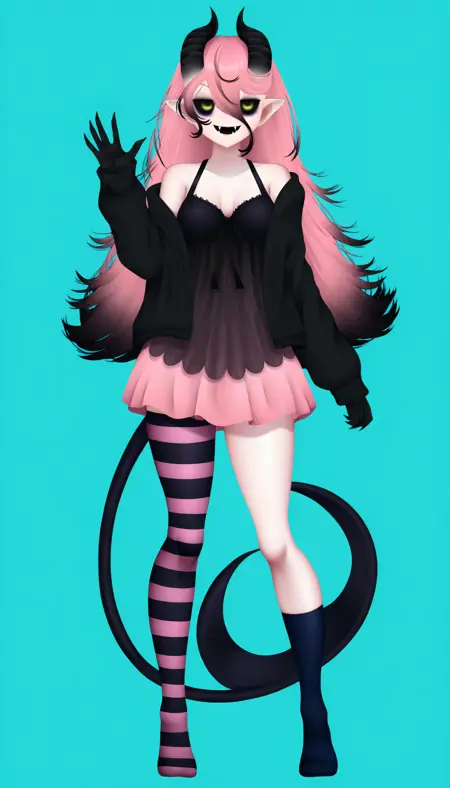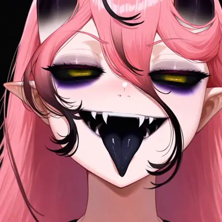 役立つタグ: PickleVT, 悪魔, 角, ピンクの髪, 多色の髪, 暗い目, 黄色い目, エルフの耳, メイク, ブラックなリップ, 悪魔の尾, 尖った歯,