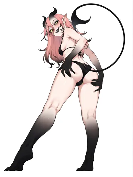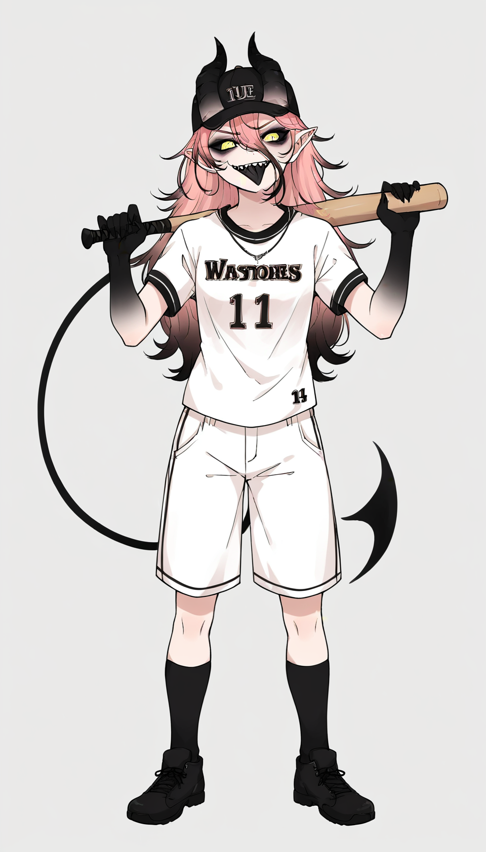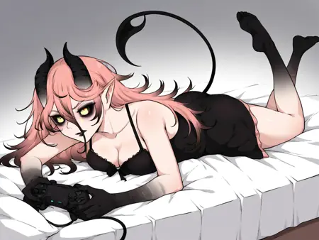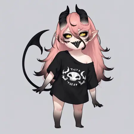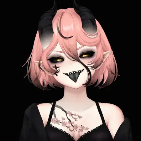 有用标签:PickleVT,恶魔,角,粉发,多色发,深色眼睛,黄眼,精灵耳,妆容,黑色唇膏,恶魔尾,尖牙,